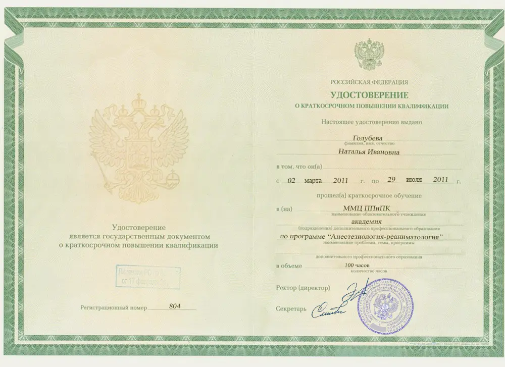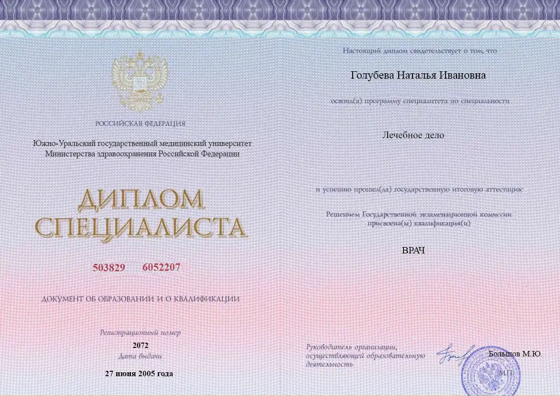 В 2005 году получила диплом по специальности «Лечебное дело» в Южно-Уральском государственном медицинском университете. В 2007 и 2011 году закончила ординатуру и курсы повышения квалификации по анестезиологии и реаниматологии.ПЕРВИЧНЫЙ ПРИЕМ: 2000 руб.