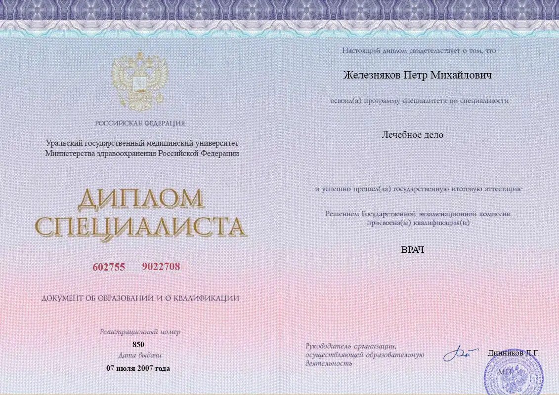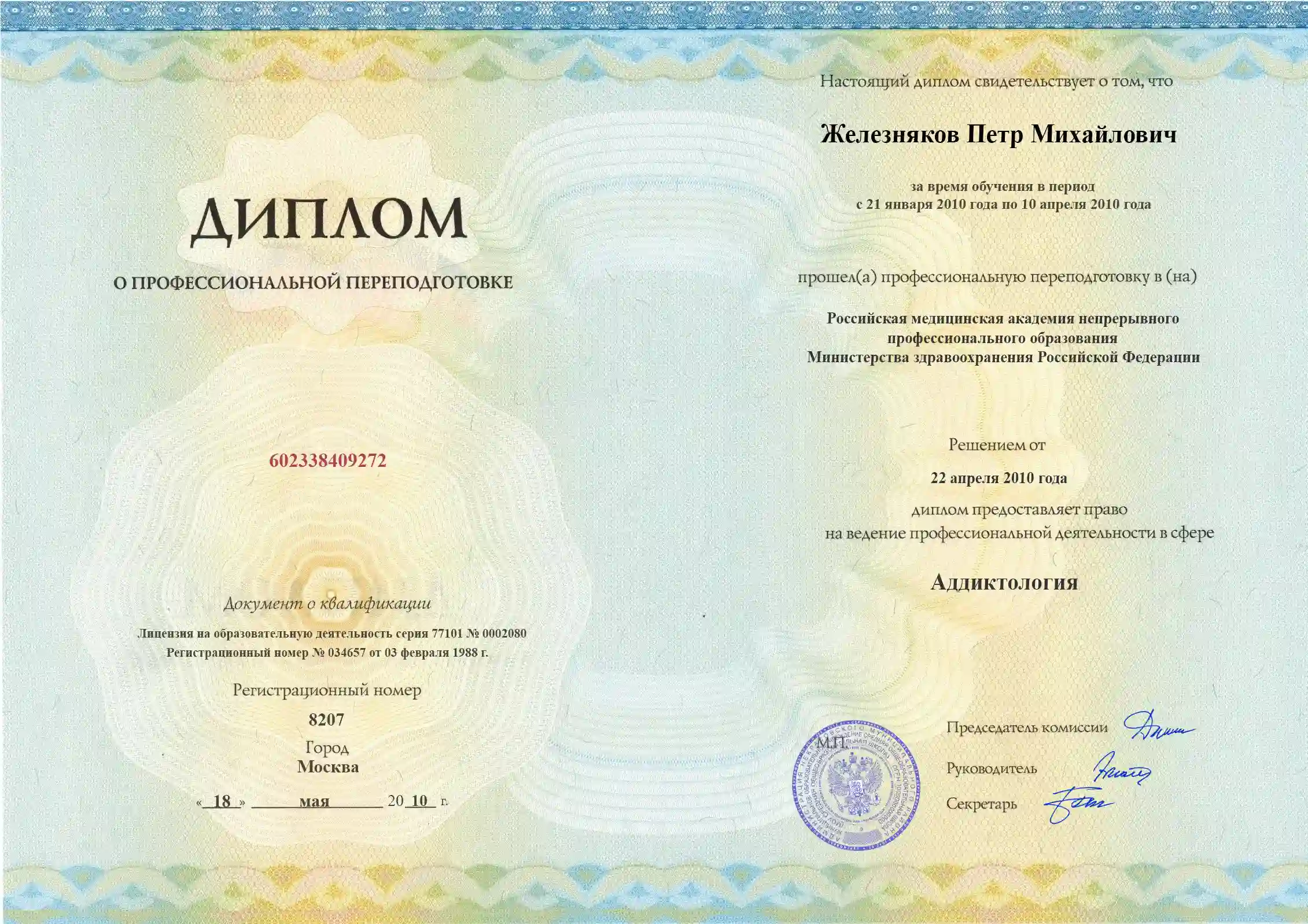 В 2007 году окончил Уральский государственный медицинский университет по специальности «Лечебное дело». В 2010 году прошёл профессиональную переподготовку по аддиктологии, получив квалификацию для работы с зависимыми пациентами. В 2020 году прошёл повышение квалификации по психиатрии-наркологии, расширив компетенции в диагностике и терапии психических и аддиктивных расстройств.